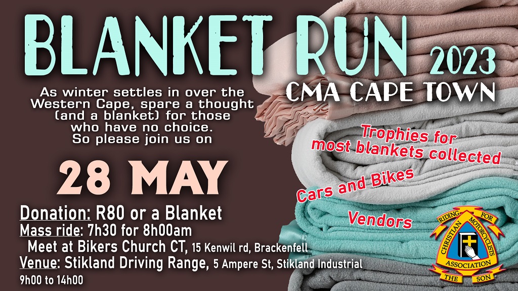 We will be supporting the Christian Motorcycle Association's 2023 Blanket Run as we've done over the years. It will take place on the 28th May (Sun) from 09h00 to 14h00 at Stikland Driving Range.